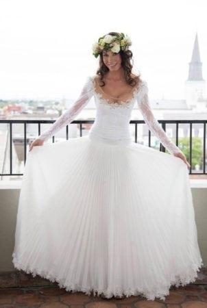 Style 355sa315 – long sleeve scoop neck wedding gown with pleated skirt
