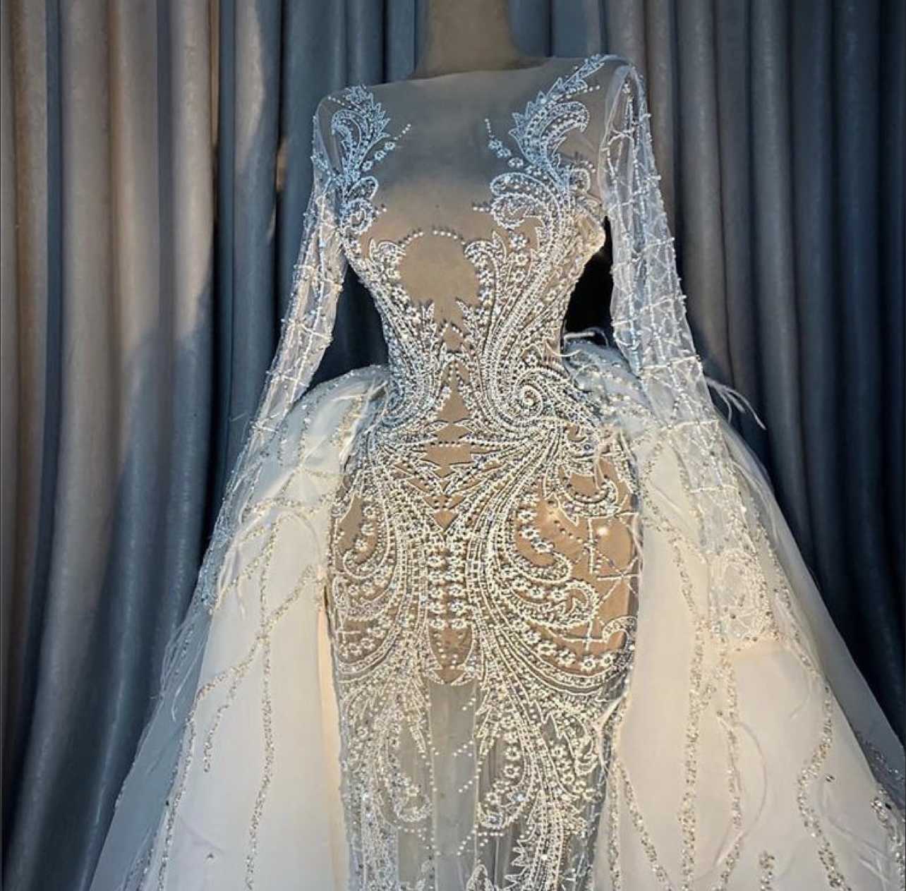 Here’s a couture long sleeve wedding gown with tones of embellishments & beading. This #sexy sheer #weddingdress is surely a #pinterestworthy #fashiondesign you can save on your #pinterestwedding boards.