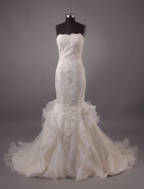 This is one of the beaded fit-n-flare bridal gowns we have available as shown or made custom just for you. This is a strapless style with a sweetheart neck line. You will see in the flare portion of the skirt has portions of organza tulle plunging from the design for dramatic effect. The beaded lace is covering the entire dress. Beaded fit-n-flare bridal gowns like this can cost well over $2000. We can make it for less.