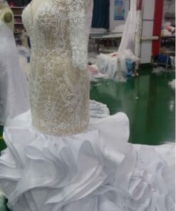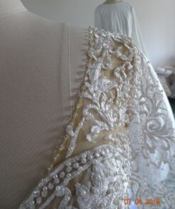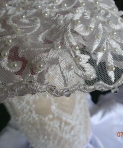 The sheer elbow length sleeves can be made with a nude lining. The flared skirt can be adjusted for each bride. Adjustments of any kind are available upon request. See other short sleeve plus size wedding gown options in our catalog.
