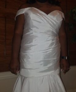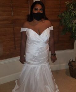This bridal dress is a simple yet elegant design that will work on many different body types. For more info on other off the shoulder plus size wedding gown options please contact us directly.