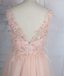 This scoop neck evening wear design has pastel feathers placed on the bodice. The backless cut is part of the fashion design. We have other sleeveless prom dresses in our catalog for consideration. For more info on custom high-low prom dresses please email us directly.