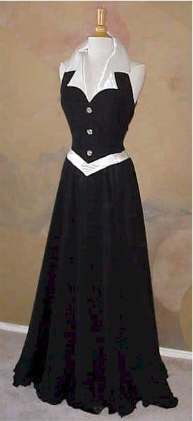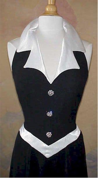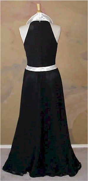 This is one of the black & white halter style formal dresses we have in our collection that was made with a stand up collar.