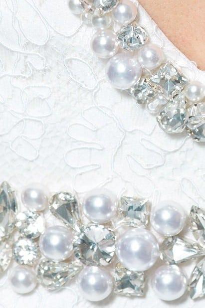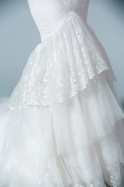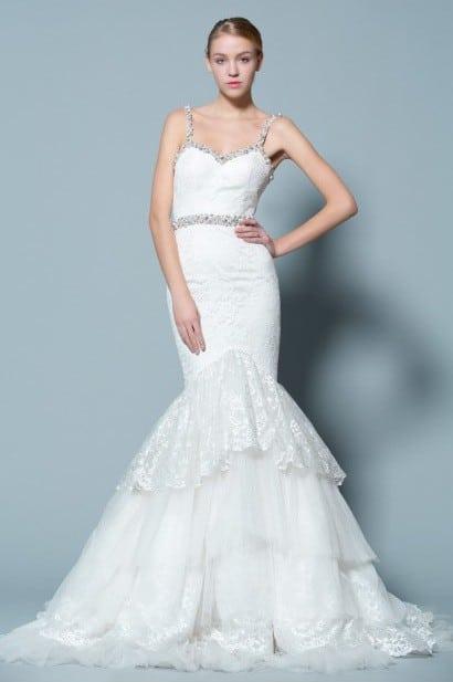 We have produced fitted lace wedding dresses for brides all over the country since 1996. This item has several great features to the design. First is the price. Dresses like this one can easily cost close to $2000 and above. Ours is well below that mark. However the quality and craftsmanship is high. There is a small beaded belt at the natural waist. This can be made to be removed or it can be sewn on permanently. These beaded spaghetti straps wrap over the top of the shoulders. Pearls, sequin and bugles are being used for the embellishment. The skirt is slightly tiered with the prettiest lace and tulle. The layers of the train can be any length you need.