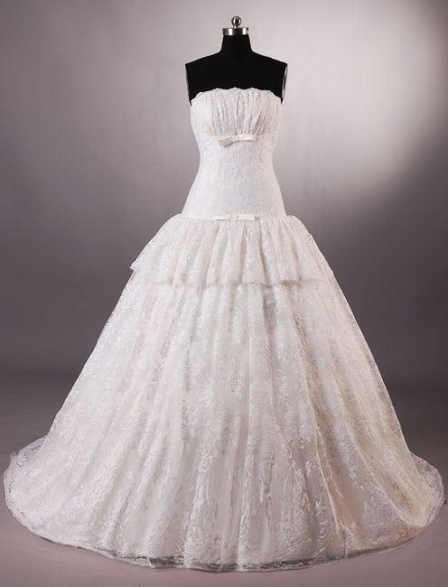 We have empire waist wedding dresses like this one which features a tiered ball gown skirt. This unique styled garment has a type of corset feel on the wide waist band. It is meant to be fitted. There is a dropped waist element to this design that can be flattering to some figures. The entire ball gown is covered in lace material. The back of this strapless piece has a lace up back. You can opt to have yours made with an invisible zipper instead if that is your preference. We have other empire waist wedding dresses you can find on our site. Simply use the convenient product tags above to get to those items.