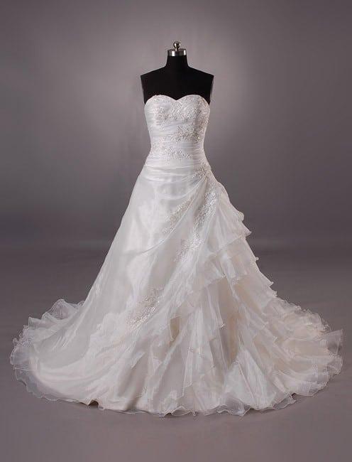 We have organza wedding gowns like this one available for you. This strapless gown has a beaded bodice. The organza appears as though it has a wrapped effect around the skirt section of the dress. there is a built-in crinoline on this lovely gown. We can create a longer train for this style if that is what you want. Any length is doable. You can have the bodice more or less encrusted with bugle beads, crystals, pearls and sequin. We have many other organza wedding gowns with a sweetheart neckline. Just click on any of the tags for this product to see similar items like this one.