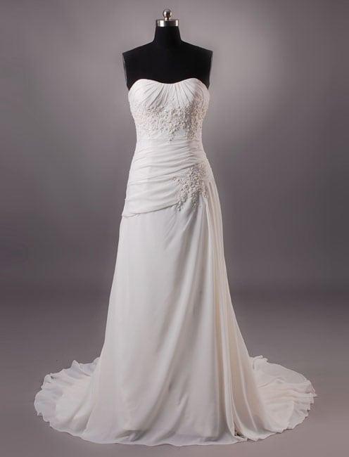 This is one of the informal wedding dresses from the collection that has gathers and light beading on lace. Some may call it ruching or shirring but the draping of the fabric across the body is elegant and simple. This lovely piece would look great as an evening wear item as well. Can you imagine this great style in a color like black, red or even silver. This is one of those garments that translate well in a number of different colors even with the light embellishment of lace. It is not really prominent but the lace embellishment just under the bust line makes this appear to be an empire waist wedding gown. These types of cuts are so flattering on so many different body types. If you like we could add detachable straps on this sweetheart bust line dress. That would give you the option of using them or not. We can make changes like this and many others to any styles of informal wedding dresses that are showcased in our online catalog. You can have this item made exactly to your body shapes as well. If you look at the top navigational menu above you will see there is a link for forms. there is where we have our personal measurement form. On that form you will see we have a diagram there for your tailor to follow. this will make it to where your gown will fit the best it can.