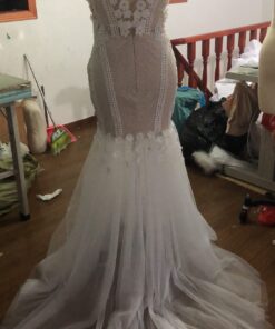 This v-neckline bridal gown was made per a brides request. She wanted to use the Pallas Couture design Cadencia as her inspiration for her custom dress. The original was just under $12,000. Our version is not exact. But it does give a similar shape, style and design for way less. So if you are a bride on a budget please consider having a replication of your favorite haute couture wedding gown made by our US dress design firm.