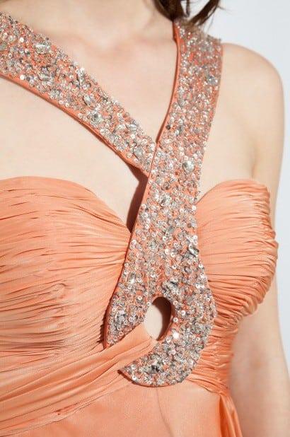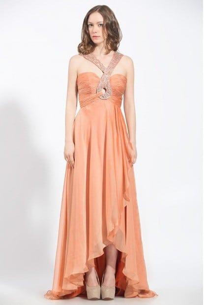 Our company produces high low Special Occasion Dresses. Garments like this can be used for prom and other formal social occasions as well. This gown has shirring (or what some people call ruching ) on the bust. The halter straps are beaded into a swirl design that moves through the bust line. Because of the way the bust line is cut this has an empire waist line. We can make this for you with a shorter or longer even hemmed skirt. You can have this produce in any color from our color chart. To see more high low special occasion dresses please click on the tag. You can also change any design on our site to have a skirt like this one.