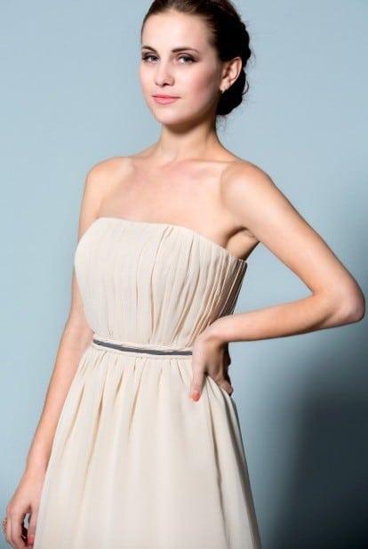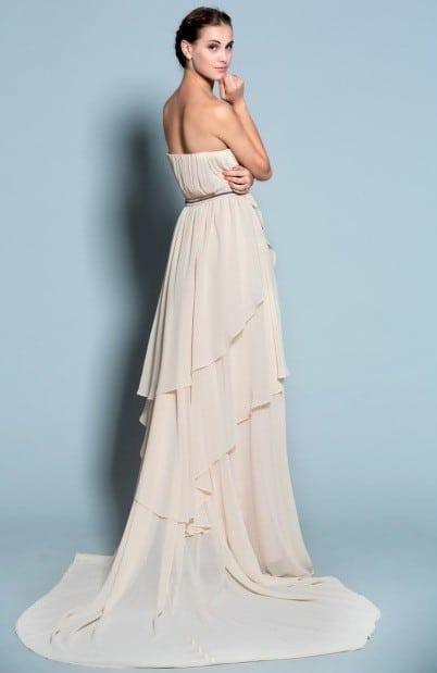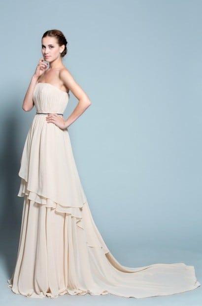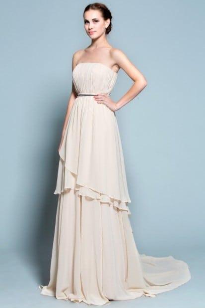 Our company produces elegant tiered skirt evening dresses like this in any sizes. This would look great on a plus size women also. This strapless gown does not have very many embellishments on the garment. There is a belted feature just under the bust line for an empire waist look. This item can be made with an illusion neckline if the customer wants to be a bit more modest. We can make this garment in any color from our color chart. You can also request any other change you want to the gown. We will accommodate all special request to make this dress meet your preferences. You can see other tiered skirt evening dresses in our main catalog. Just use the links above near the product image.