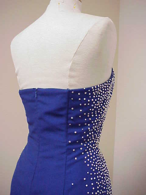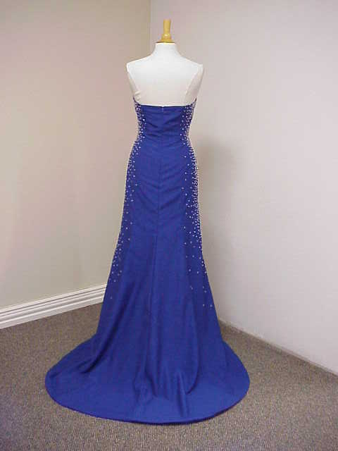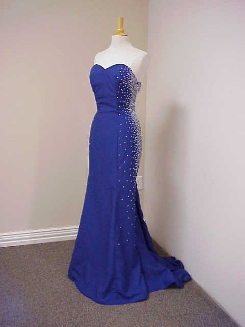 If you have been searching for blue evening dresses for your very special formal occasion then here is one to consider. The only embellishment that is on this lovely blue dress are a plentiful amount of swarovski crystals in a fade and scatter pattern on the sides of the gown. There is a chiffon fall that is detachable with this gown.