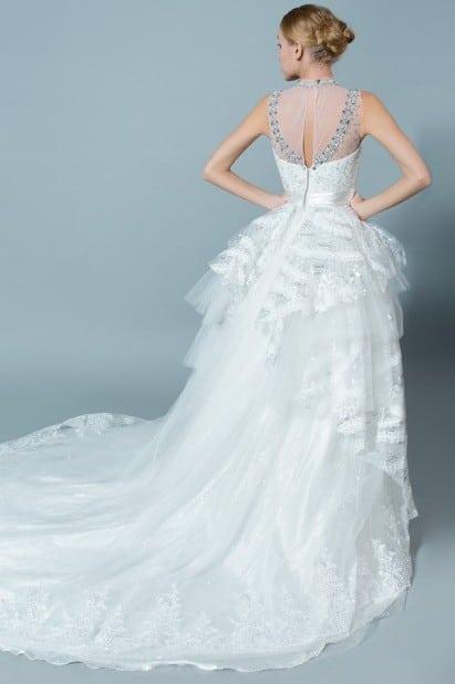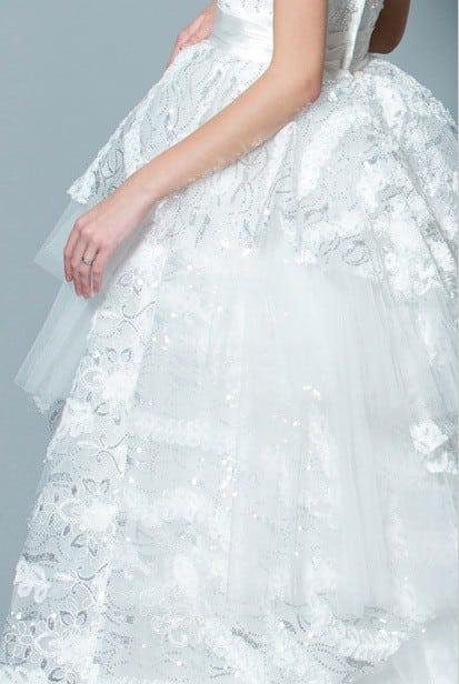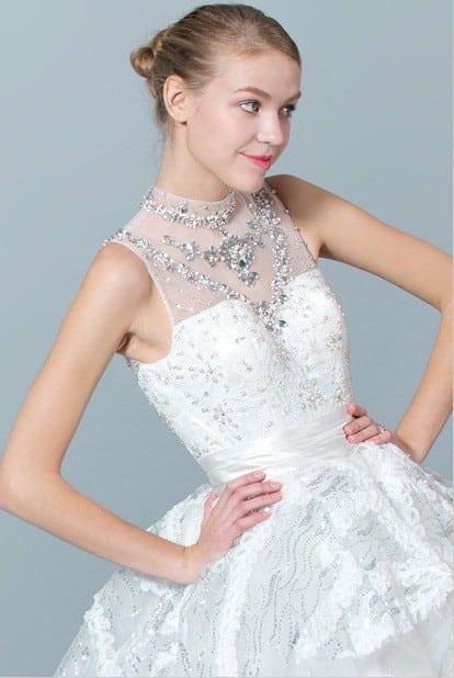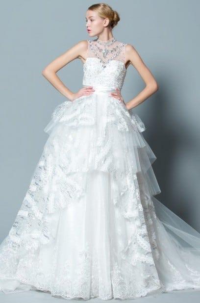 We have couture bridal gowns like this that were made with illusion necklines. The beading on the sheer portion of this upper bodice adds drama and flare to the style. This garment was created with lace and tulle. The combination of those fabrics are what help create the tiered full ball gown skirt. There are no sleeves on this dress. But if you wanted you could request that sleeves be added to the design. We can make this for you in any size and with any changes you need. Meanwhile please take a look at our other couture bridal gowns that we have in each collection. Thanks!