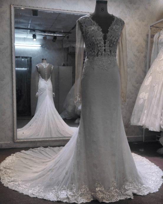 The lace detail on this wedding dress is what makes clients love the design. We can let our brides make any design changes they need to the item. You can see other sheer long sleeve wedding gowns when you visit our main catalog.