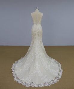 The ornate detail of this embroidery adds to the overall design. Changing the sleeve or neck line is not an issue. Various colors and sizes are also options. See other sleeveless open neckline bridal gowns in our main catalog.