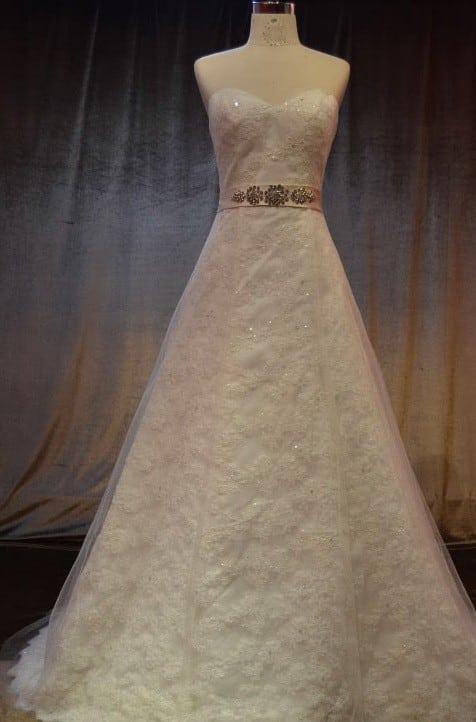 We designs and sell affordable a line bridal gowns to women from all over the globe. This solid lace design has a built in crinoline. This helps the skirt keep its shape. The strapless design allows for the bosom to be featured in this elegant cut. You will notice a detachable ribbon sash on the waist. It is lightly beaded for a bit of sparkle. Because of the lace and beading detail this a-line dress could easily cost well over $2000 in any American bridal store or wedding salon. But our cost is inexpensive at just $1600 to make this dress as you see it. If you needed to make any change to the design the cost would differ accordingly. We have many other A Line Bridal Gowns in our collection. You can find them by clicking on that topic in the product tags above.