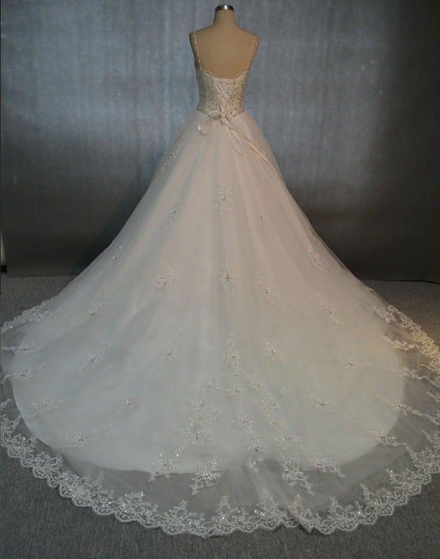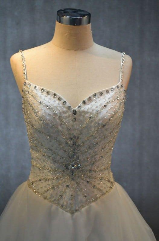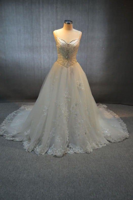 Our company provides elegant basque waist wedding gowns to women all over the globe. This spaghetti strap dress has a pointed v waistline that accentuates the frame. The entire bodice is heavily beaded with crystals and other jewels. If made in a color this would be a great option for other formal occasions. This ball gown skirt has a long chapel train. If you need it to be even longer closer to a cathedral length it would not be a problem at all. We can make any change you need to the designs shown on our site. To see more basque waist wedding gowns please go to our main catalog of dresses via the link above.
