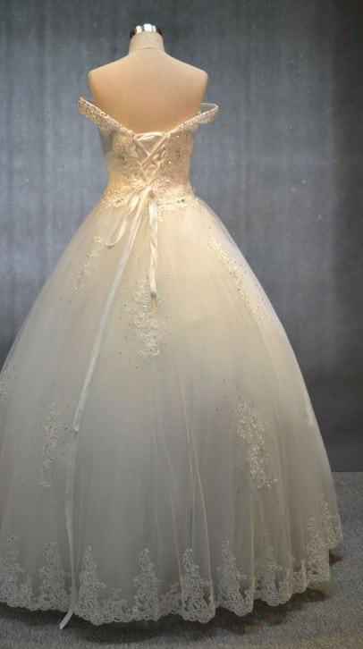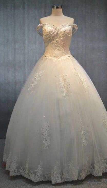 We create off the shoulder plus size wedding gowns for brides of all sizes. Each of the design we produce can be made to measure for your specific size. This ball gown style dress is heavily beaded. there are lace details as well as crystal embellishment. The open neckline will be sure to feature the bosom well. If you needed the built in crinoline to be less full that is no issue whatsoever. We have other off the shoulder plus size wedding gowns to offer as well. Each of the ball gown styles can be made special to your taste and preferences. Please contact us for more details about how we can create one for you at an affordable cost.