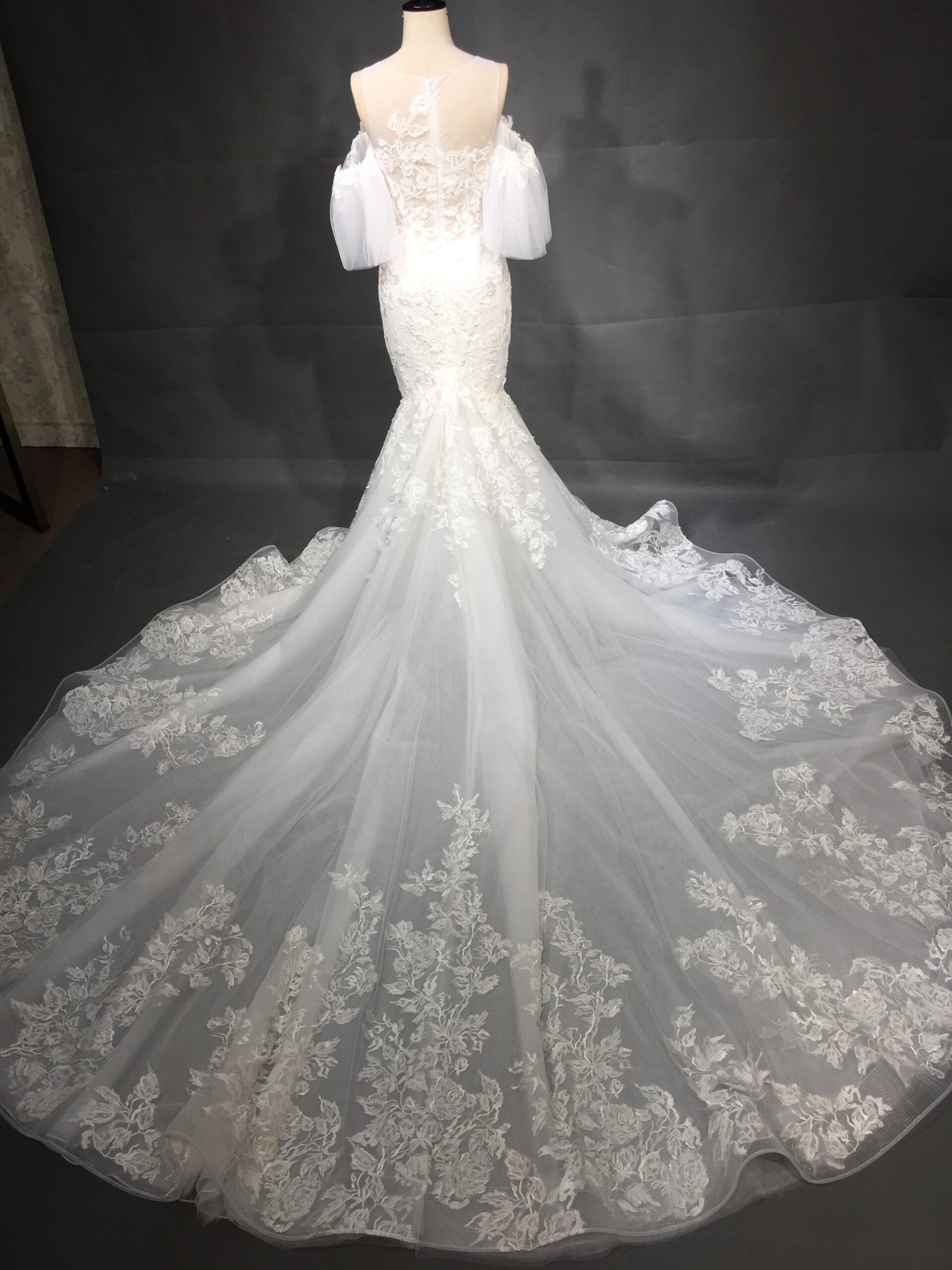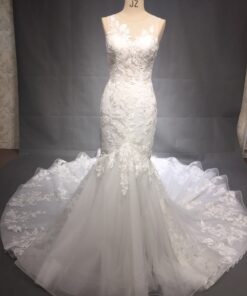 This sleek wedding dress has a beautiful long train made with intricate lace and embroidery.