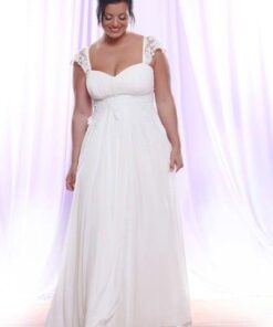 This plus size bridal gown has a flattering empire waist.  The beaded cap sleeve design covers the top part of the shoulder.