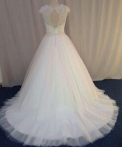 This simple a-line style of dress is great for a bride who wants to be a bit more modest and traditional. The sheer illusion neckline is flattering. You can easily add sleeves of any length to this design. We have any other plus size wedding ball gown styles for you to consider.