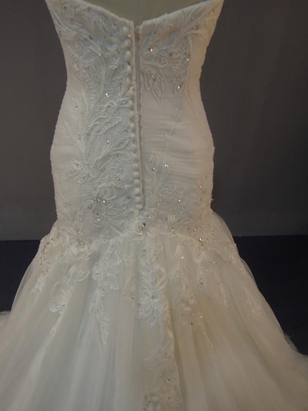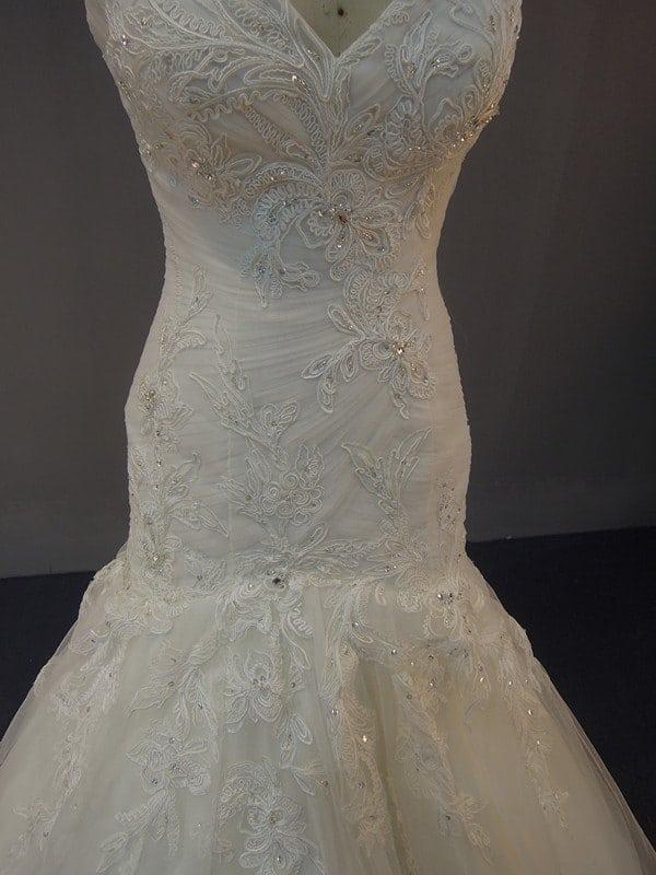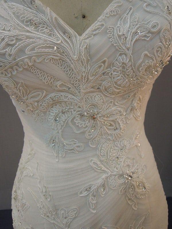 The ornate detail on this fitted wedding dress is the main fashion point. We can make this bridal dress as shown or with any changes. To see other embroidered bridal gowns you can customize visit our main catalog of dresses.