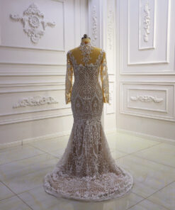 This elegant church style bridal dress can be customized. Lining can be placed on the sheer portions. You can also remove any portion of the dress to make it more revealing. To see other sheer long sleeve illusion neckline wedding gown options please email us directly or use the search tool.