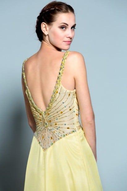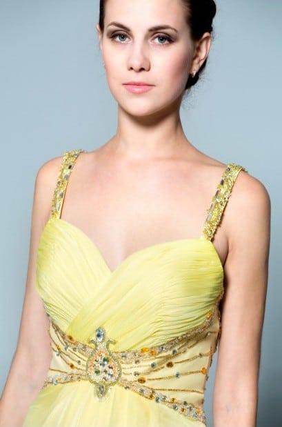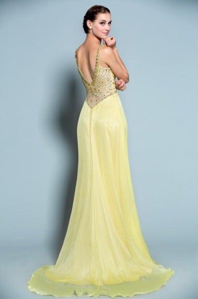 Our company produces yellow evening dresses for all special occasions. Garments like this one can be used for a variety of formal wear events. This gown has straps that are beaded. You can have these be detachable if you want to have the option of removing them. If you like empire waist dresses then this is one to consider. The beading is placed just under the bust line to create that type of waist. There is a V pattern design on the bodice for effect. The chiffon skirt is flowing and moves freely as you walk. This is a perfect dress for prom, pageant or any other semi-formal event. We have several other yellow evening dresses that can be viewed. Simply click on the tag called yellow to see others that were sampled in that color. Keep in mind all of the designer dresses on our site can be made with any changes and in any size.